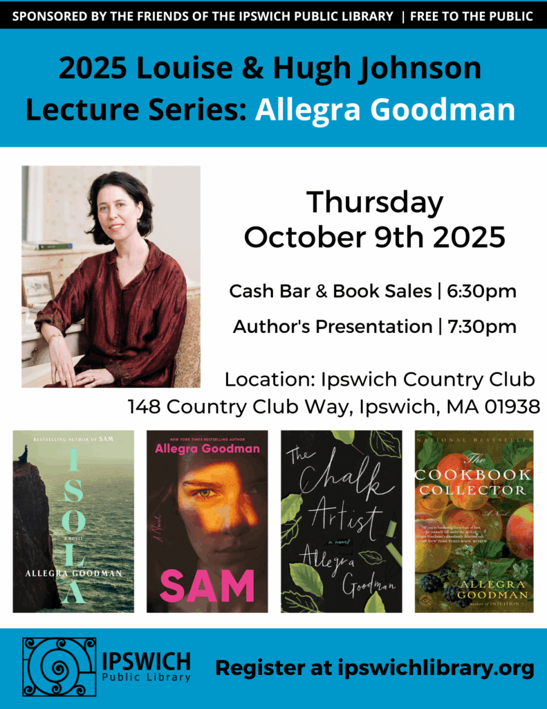 The Louise & Hugh Johnson Lecture series began in 2017 and hosts well-known regional and national authors. This series is held at the Ipswich Country Club (148 Country Club Way, Ipswich). These events are free and feature a cash bar and free light refreshments.